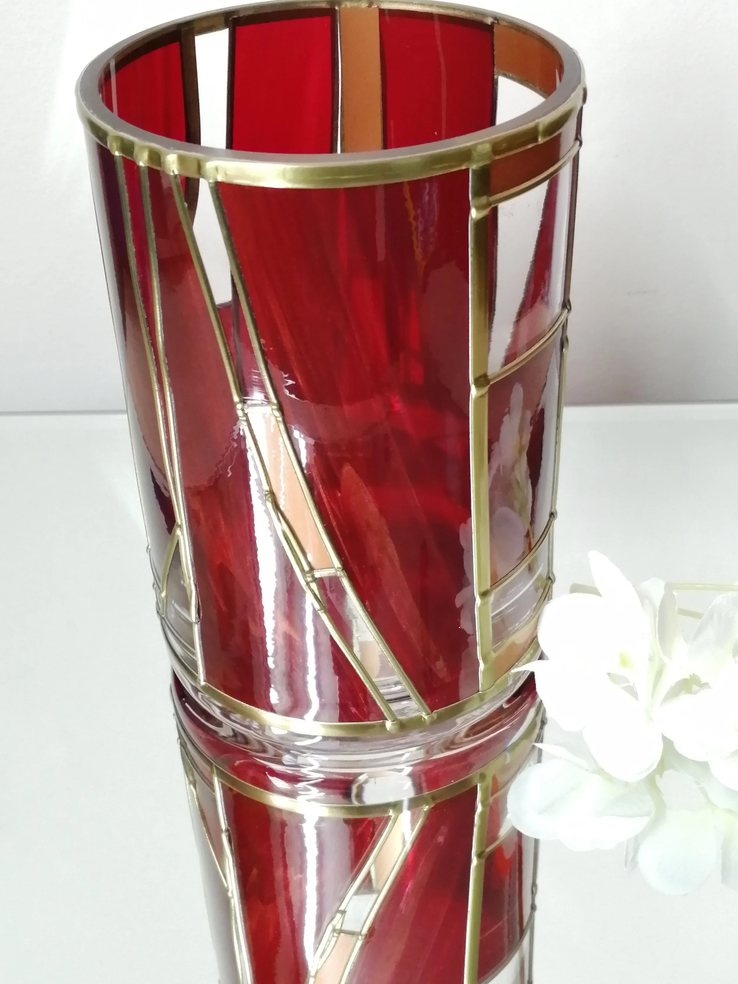 This is a hand-blown, rustic glass vase in a mid-century leaded design with clean lines, organic shapes, and minimal embellishment, a popular design style from roughly the 1930s through the mid-1960s. Add flowers and enjoy. Even without flowers, this is a stunning piece. Place it by a window and let the light flow through the colours. In the winter, add some fairy lights. Mid-Century Art Deco with a Mosaic feel.